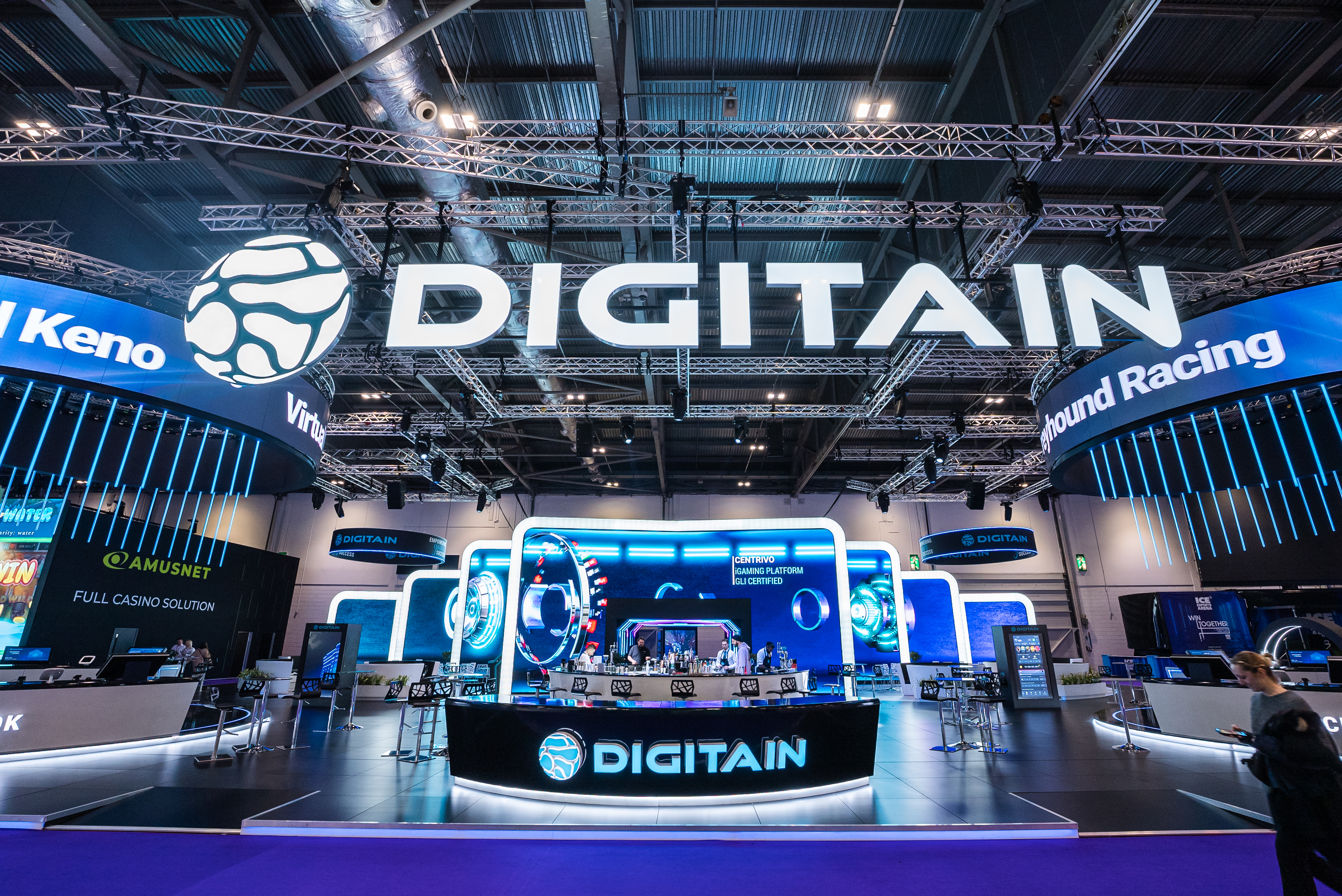 An internally lit Digitain logo suspended above the stand, reinforcing brand identity