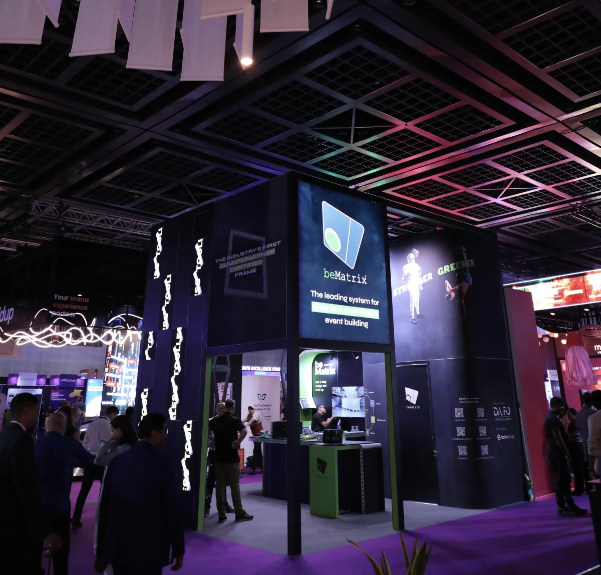 We delivered a fully modular and reusable stand leveraging the beMatrix ergonomic frame system. The structure was precision-built during pre-show prep and installed live on-site, offering both flexibility and design impact while reducing material waste.