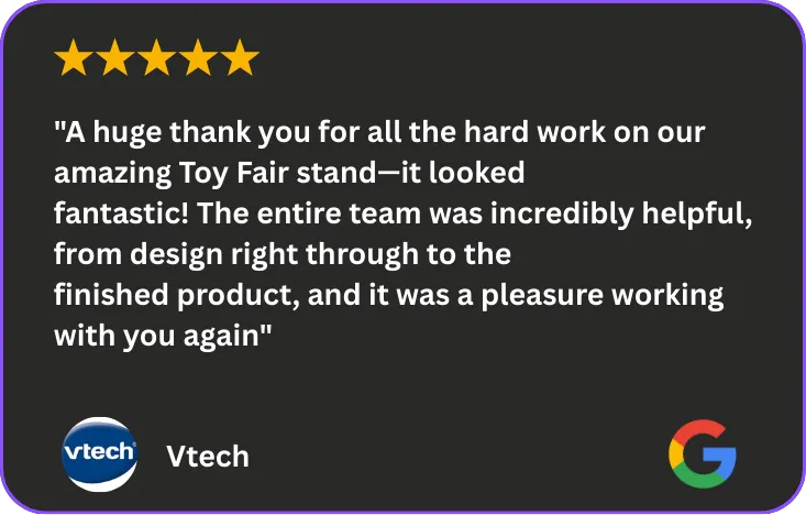 Over 18 years, we've delivered 200+ exhibition stands with a 100% on-time delivery rate and zero on-site failures. Many of our clients (like Hozelock) have been working with us for 3+ years across multiple shows.